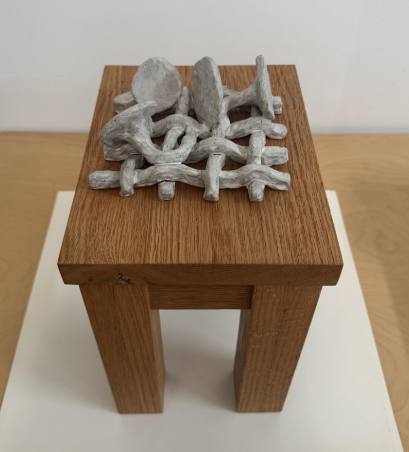 Meg Rotzel, "Nasturtium Grid (after Ducrot & Braciale)" 2025, Single-fired ceramic and slip, oak stool, linen, 14" x 10" x 8". Courtesy of the artist. -