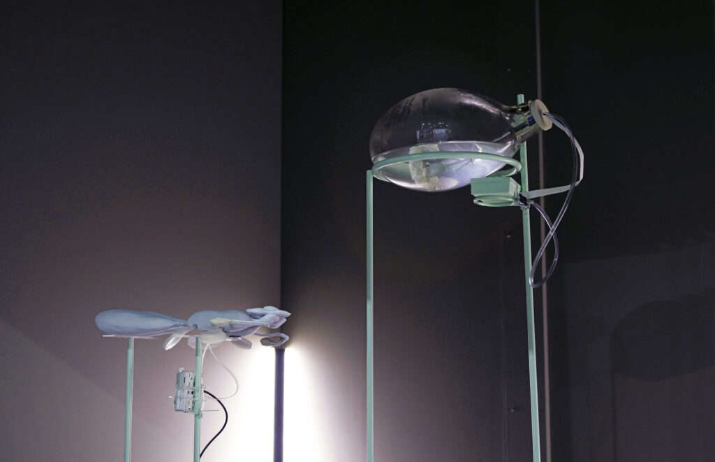 Diana Sánchez, "Machine Kinship: The Impossible Duet" 2022, Sound, machine learning, silicone, electronics, glass, water, proteins, air, steel base, 4’ x 4’. Courtesy of the artist. -