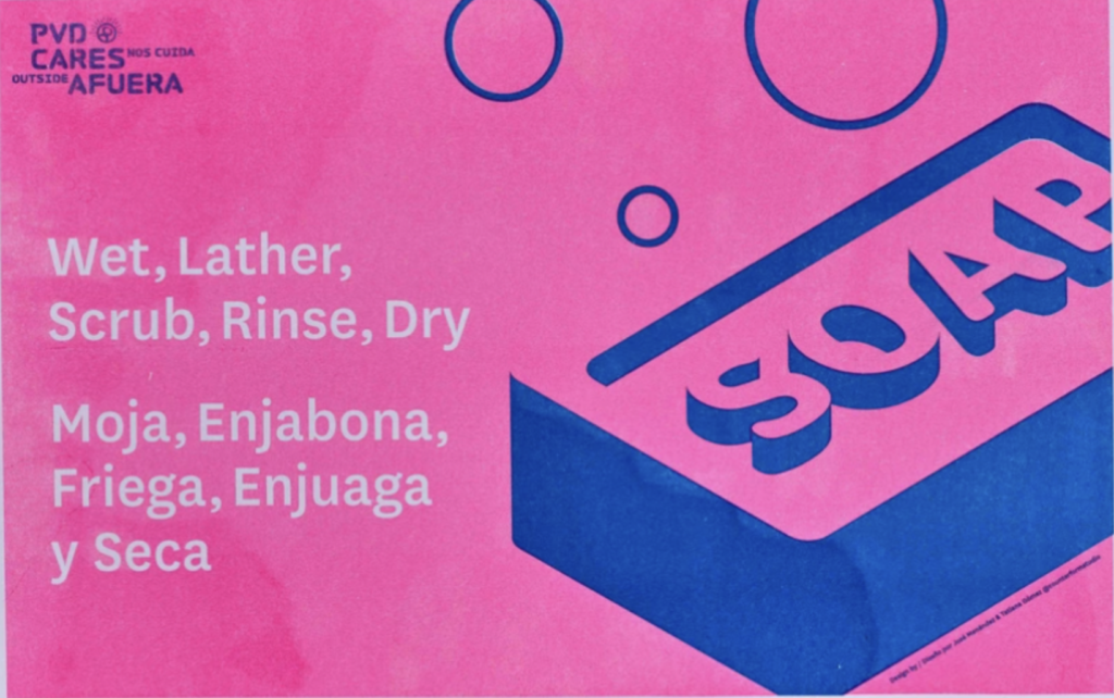 buena gráfica studio, "PVD Cares Outside/PVD nos cuida afuera Wash, Lather, Scrub, Rinse, Dry/Moja, enjabona, friega, enjuaga y seca" 2020, Risograph print, 11” x 17”. Courtesy of the artist. -