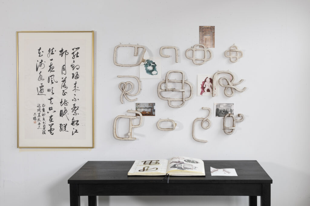 Meg Rotzel, "The Word (Nai & Grace)" 2025, Single-fired ceramic and slip, ink, paper, graphite, 2024 sketchbook, framed gift of calligraphy, postcard, table Dimensions Variable. Courtesy of the artist.