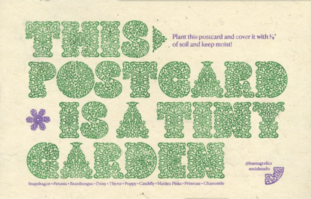 José Menéndez (buena gráfica studio), "This Postcard is A Tiny Garden" 2024, Risograph print on seed paper, 5.5” x 8.5”. Courtesy of the artist. -